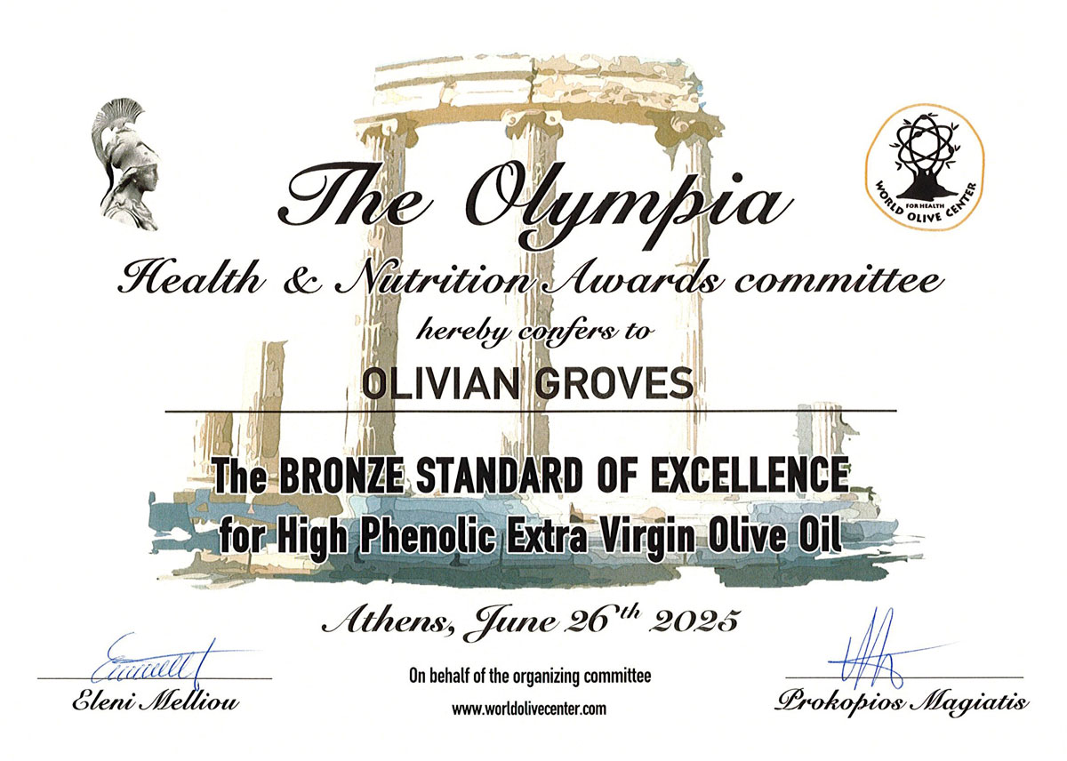 OLIVIAN GROVES proudly celebrates OLIVIAN EVOO’s Bronze Award at the Olympia Olive Oil Awards 2024–2025, a competition dedicated to excellence in extra virgin olive oil.
