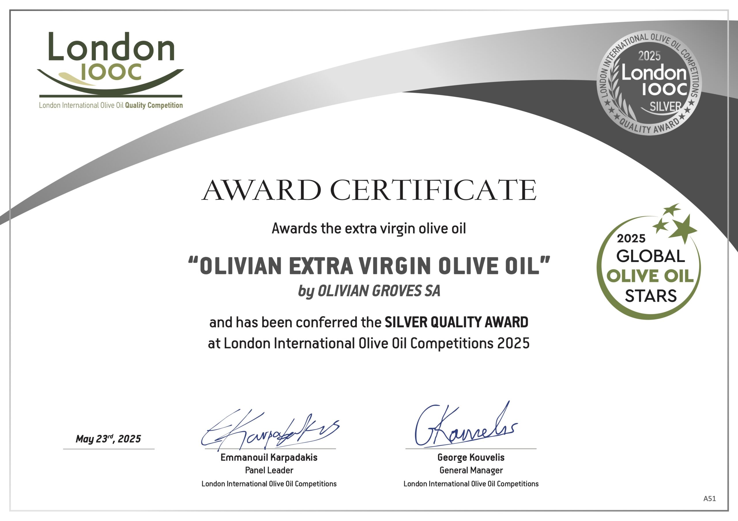 OLIVIAN GROVES proudly announces that OLIVIAN EVOO has received the Silver Award at the London International Olive Oil Competition (IOOC) 2025, one of the world’s most respected olive oil competitions.